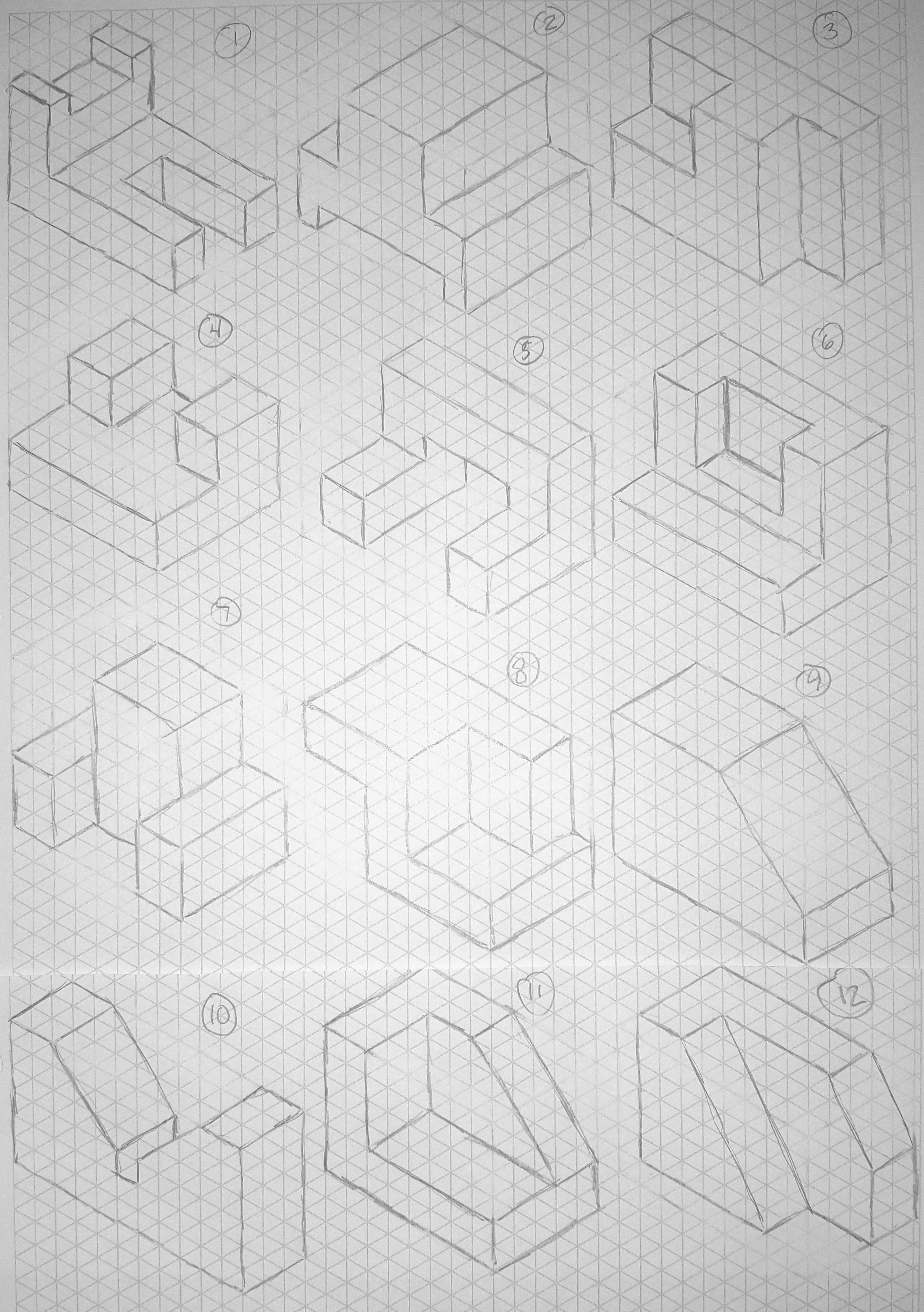 We're shifting gears today. Instead of projecting isometric shapes based on orthographic drawings, you will derive orthographic drawings based on isometric projections. Use these isometric figures as your source material and draw them out on Worksheet H, which will be provided in hardcopy for your use. You should be able to complete this assignment by the end of the bell.